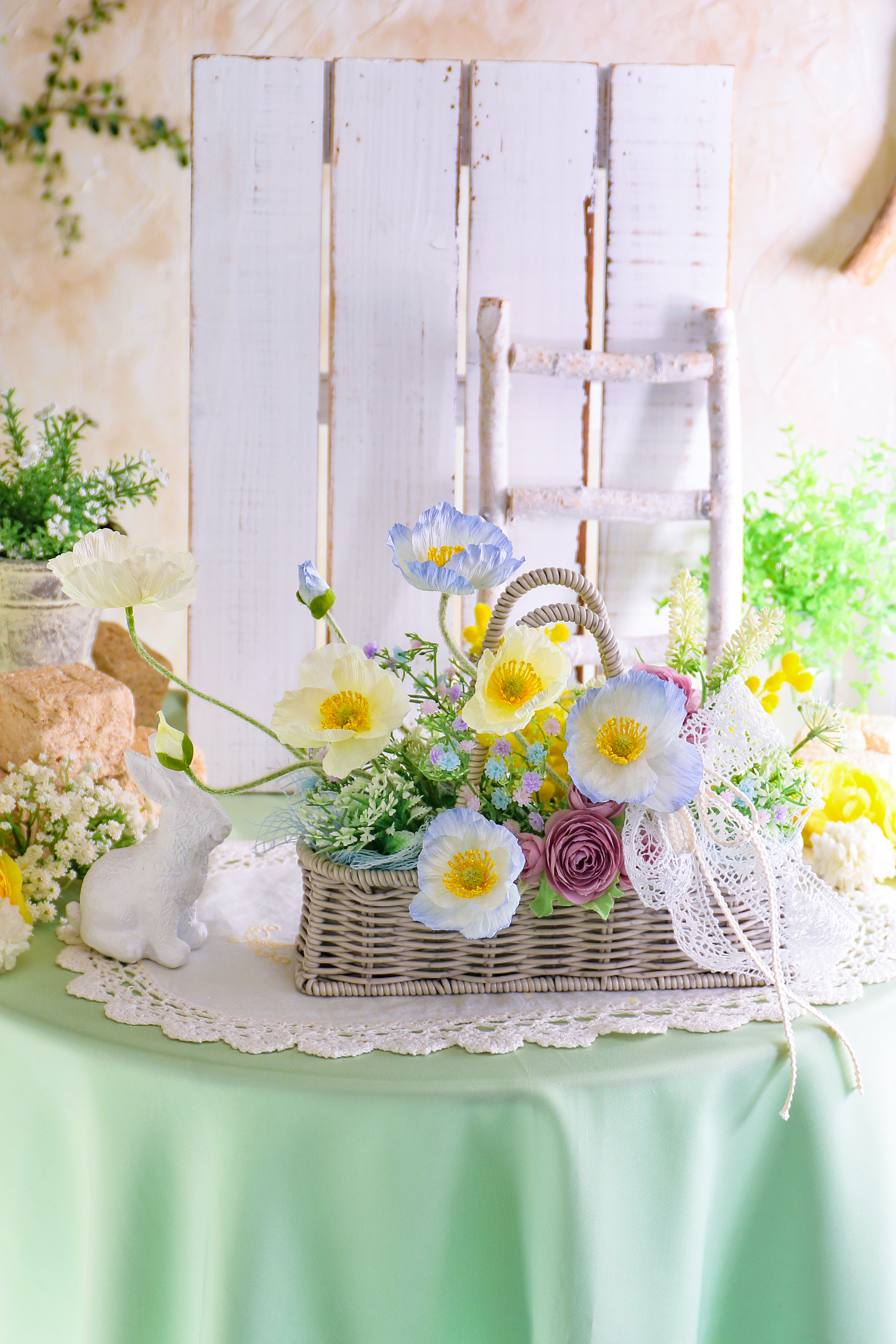 アートフラワーで作る、春風のようなバスケットアレンジです。淡い色合いと優しいリズムが、お部屋に春のあたたかな空気を運んでくれます。玄関やリビングに飾って、春を迎えるひとときをお楽しみくださいませ♪